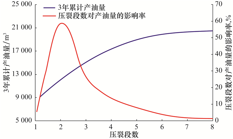 1) 压裂段数优化。模拟结果表明,3年累计产油量随压裂段数增多而增大,增加幅度随压裂段数增加而下降,大于7段后,压裂段数对累计产油量的影响率低于2%(见图1),因此,建议压裂段数选择6~7段。