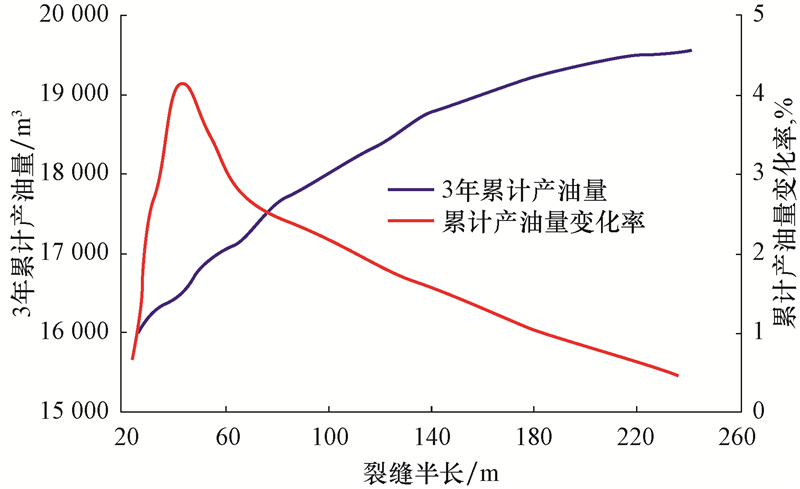 2) 裂缝半长优化。对于超低渗透油藏,增加裂缝半长可有效提高单井泄油面积,提高储层改造效果[7]。以3年累计产油量为目标,优化裂缝半长为160~180 m,当裂缝半长大于180 m后,累计产油量的变化率低于1%(见图2)。