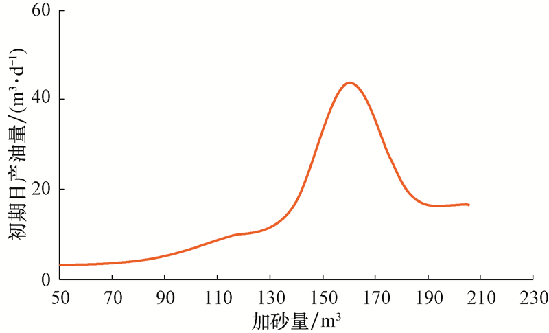 | 图5 初始产量与加砂量的关系 Fig.5 Relationship between sand added in the treatment and initial productivity |