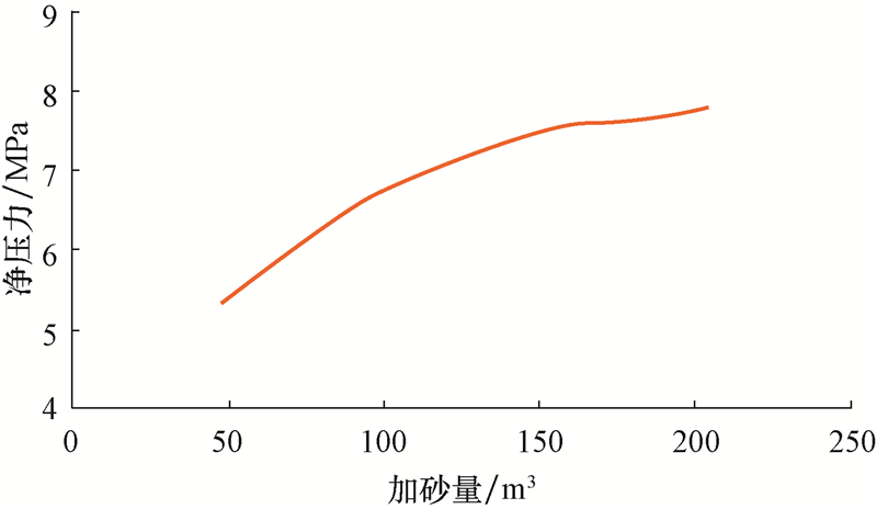 | 图6 净压力与加砂量的关系 Fig.6 Relationship between sand added in the treatment and net pressure |