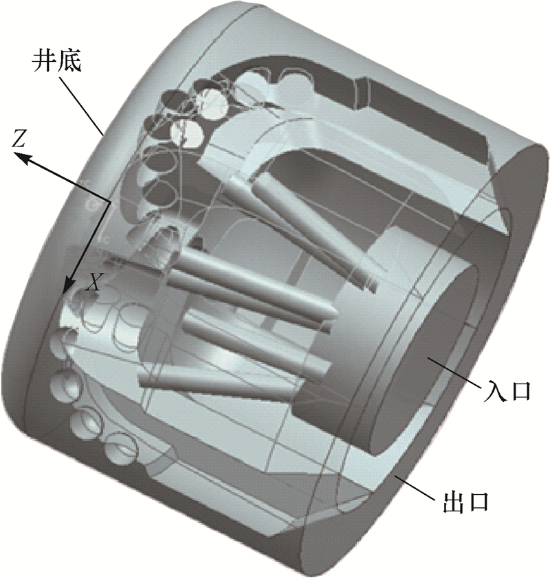 PDC钻头井底流场异常复杂,解析法不能对其详细描述,试验方法耗时耗力,前人主要利用数值模拟的方法进行了大量研究[5, 6, 7],但仍存在以下几个问题:1)均将井底流场假设为钻井液的单相流场,不符合实际情况;2)仅对速度场和压力场等进行一些定性分析,不够量化,也没有涉及岩屑本身,对岩屑运动的研究仅仅是环空内的岩屑运移[8];3)没有明确地提出判别井底流场优劣的参数指标,也未涉及钻头泥包的本质问题(岩屑黏附)[9]。为此,笔者基于FLUENT软件DPM,采用岩屑颗粒捕获率作为反映钻头泥包概率的评价参数,研究水力因素对PDC钻头防泥包性能的影响规律,以期为钻头防泥包设计提供理论指导。