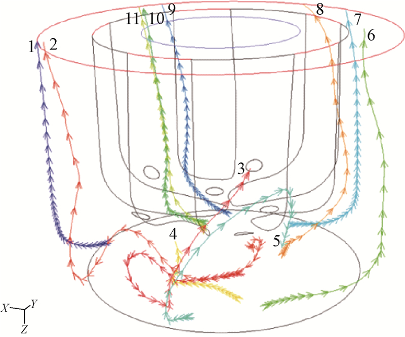 5 岩屑颗粒捕获率影响因素分析模拟中岩屑颗粒数量等于井底平面网格数量,岩屑输运轨迹数过多会造成画面混乱。为便于观察,选取典型的11条岩屑颗粒输运轨迹进行分析,结果见图 3。