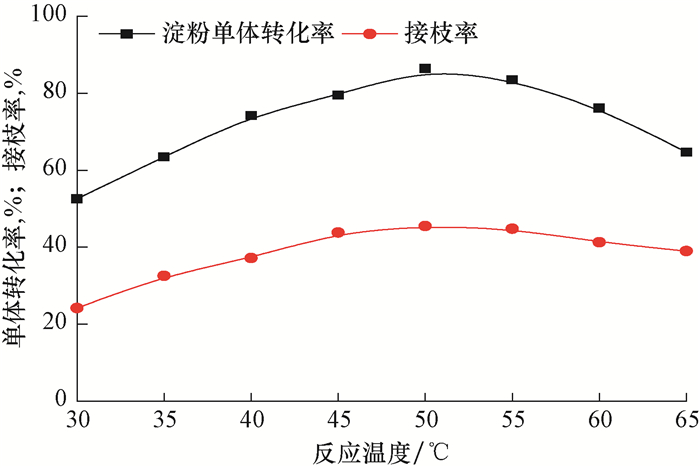 | 图 1 反应温度对淀粉单体转化率和接枝率的影响 Fig.1 Impact of the reaction temperature on starch monomer conversion and graft ratio |