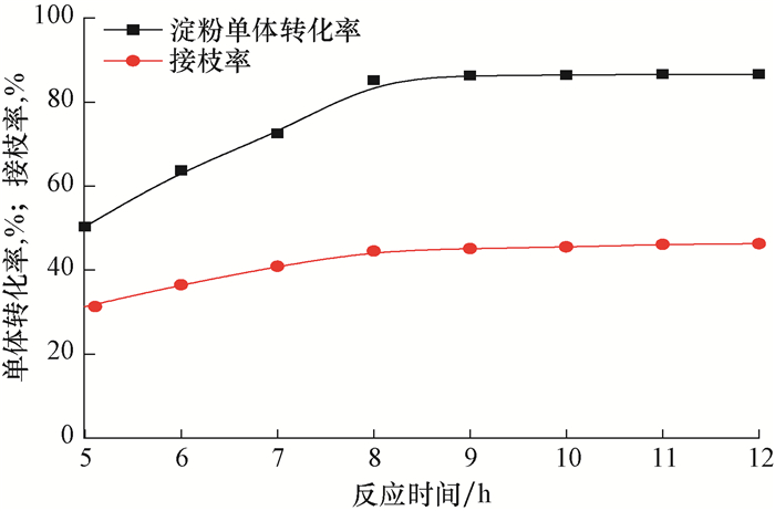由图 2可知,随着反应时间增长,淀粉单体转化率和接枝率随之增大,当反应时间为8.0 h时,淀粉单体转化率和接枝率达到最大,然后保持稳定。这说明,在反应初期,反应物中接枝活性自由基较多,接枝反应迅速进行;一定时间后,由于反应体系黏度增大,在一定程度上阻碍了活性自由基的扩展作用,相互碰撞的频率降低,接枝反应速度减慢,从而导致淀粉单体转化率和接枝率不再增大。因此,最佳反应时间为8.0 h。