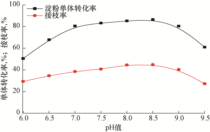 由图 3可知,随着pH值增大,淀粉单体转化率和接枝率先增大后减小,表明pH值较低或较高均不利于活性自由基生成。当pH值在7.5~8.5时,淀粉单体转化率和接枝率维持在较高水平,说明此时引发生成的活性自由基较多,有利于接枝反应迅速进行。因此,接枝反应的最佳pH值为8.5。