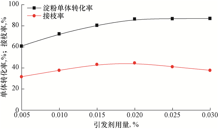 | 图 4 引发剂用量对淀粉单体转化率和接枝率的影响 Fig.4 Impact of initiator dosage on starch monomer conversion and graft ratio |