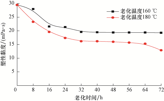 | 图 6 ZNJ-1溶液的塑性黏度随老化时间的变化曲线 Fig.6 Correlation between PV of ZNJ-1 solution and aging time |
