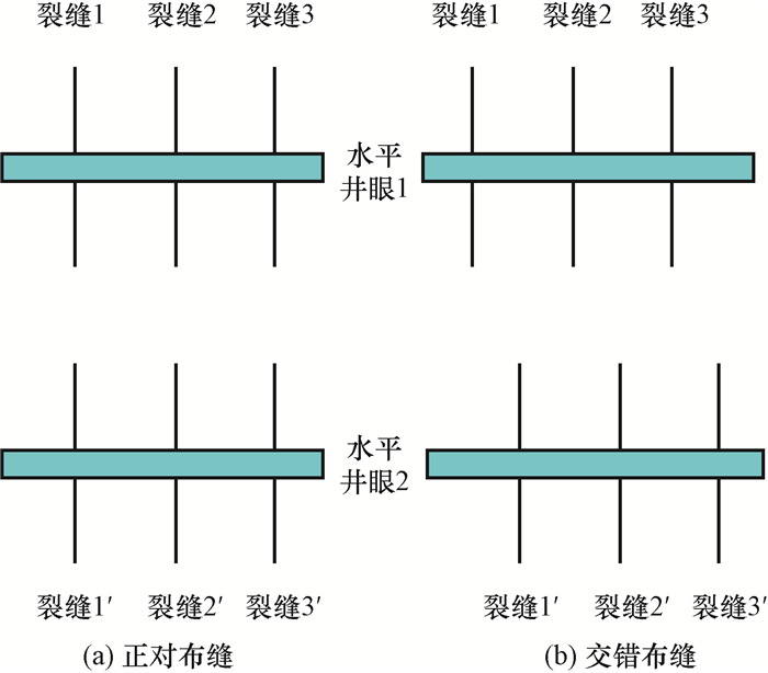 | 图 1 水平井组布缝示意 Fig.1 Schematic design of zipper fractures in horizontal wells |