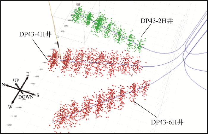 DP43-1H井和DP43-2H井单独压裂,DP43-4H井与DP43-6H井以及DP43-3H井与DP43-5H井分别同步压裂,井组压裂后平均无阻流量达到相邻水平井的1.52倍[12]。DP43-2H井、DP43-4H井和DP43-6H井采用井下微地震监测,DP43-1H井、DP43-3H井和DP43-5H井应用地面测斜仪监测。井下微地震监测结果表明,同步压裂的DP43-4H井与DP43-6H井较单独压裂的DP43-2H井相比,裂缝带宽更宽,裂缝更复杂,改造体积更大(见图 10)。
