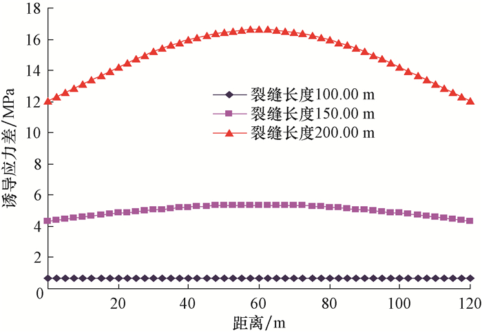 从图 5可以看出,相同的裂缝长度增加值对诱导应力差的影响是不相同的,裂缝长度从150.00 m到200.00 m的诱导应力差增加值远大于从100.00 m到150.00 m的诱导应力差增加值,这也说明两井间的裂缝越近,应力叠加作用越明显;当裂缝长度达到200.00 m时,诱导应力差超过了原始最大主应力与最小主应力的差值。因此,要使两井间区域形成复杂的转向缝或次生裂缝,提高改造体积,缝长比(缝长/井距)应达到0.3以上。