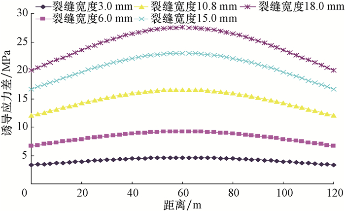 从图 6可以看出,裂缝宽度增大,有利于提高诱导应力差,当裂缝宽度为3.0 mm时,两井中间位置处的诱导应力差小于5 MPa,远小于地层的原始应力差,当2口井的裂缝宽度达到18.0 mm时,两井中间位置处的诱导应力差大于20 MPa。水平井如果实施同步压裂,缝宽会同步增大,当2口井的缝宽达到最大时,产生的诱导应力差也达到最大,因此,同步压裂有可能产生远远超过地层原始应力差的诱导应力,使裂缝更加复杂,增大改造体积,提高压裂效果。