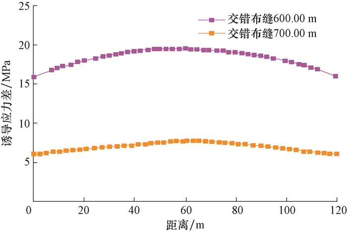 2.3 水平井组井距对诱导应力场的影响前述其他裂缝参数不变,水平井组井距为600.00和700.00 m时,计算得到两井中间位置处离裂缝壁面不同距离的诱导应力差变化曲线(见图 7)。