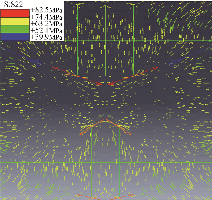 从图 3可以看出,在相同的井距和裂缝长度条件下,人工裂缝交错布置方式有利于产生较高的诱导应力,较裂缝正对布置方式可提高诱导应力差5.5~9.5 MPa。从交错布缝裂缝方位变化矢量图(见图 4)可以看出,在两井之间有一个明显的裂缝方位反转区域,使两井之间的裂缝系统更加复杂。