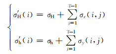 两井同步压裂人工裂缝形成过程中,井眼周围主应力场由原地应力场和人工裂缝产生的诱导应力场组成。根据叠加原理,两井之间任意位置处i的应力为:
