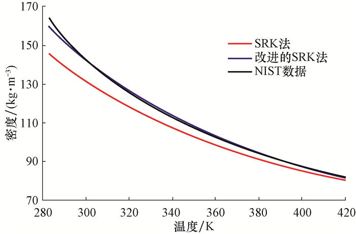 图 2为压力15 MPa条件下,应用SRK方法和改进的SRK方法得到的页岩气密度以及NIST标准页岩气密度随温度的变化曲线。