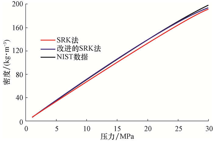 图 3为温度353.15 K条件下,应用SRK方法和改进的SRK方法得到的页岩气密度和NIST标准页岩气密度随压力的变化曲线。