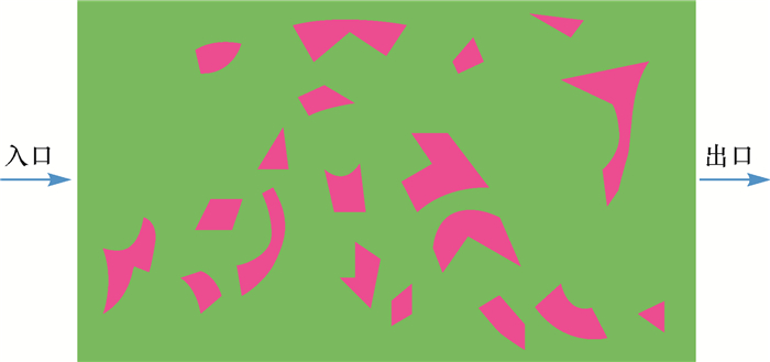 1.2 充填层二维结构模型根据裂缝几何特征,可将压裂裂缝结构简化为平面结构,这样在进行数值模拟时既可节约运算空间,提高运算速度,也可提高计算精度。以可视化平板左下角顶点为二维笛卡尔坐标系原点建立坐标系,截取x方向0.4 m、y方向0.2 m形成的矩形结构为部分通道压裂裂缝模型(见图 3)。利用所形成的通道与支撑剂充填层在图片上的色彩模式(RGB)值,编制通道结构扫描软件,根据扫描结果建立通道压裂裂缝平面结构简图,如图 4所示(图中红色部分为空隙通道,绿色部分为支撑剂充填层,左侧为流体入口,右侧为流体出口)。