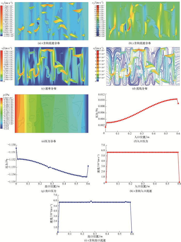 从图 5(a)可以看出:通道压裂充填层中x方向流速总体上表现为在支撑剂充填层部分速度较低,在空隙通道结构内速度较高;空隙通道结构在x方向发育越长,流体在空隙通道内x方向的流速越大,在井底流压48.92 MPa条件下最大可达1.70×10-4 m/s,若空隙通道结构总体上沿y方向发育,则流体在空隙通道内的x方向流速较小,甚至出现负值,可达-1.33×10-5 m/s。同理,从图 5(b)可以看出,y方向的流速分布规律与x方向相似。从图 5(c)、图 5(h)和图 5(i)可以看出,在充填层结构变化较密集的区域流速变化较大,相对稳定的区域如出入口则变化较小,空隙通道结构所在部分的垂向方向常形成流体流速极低的区域。