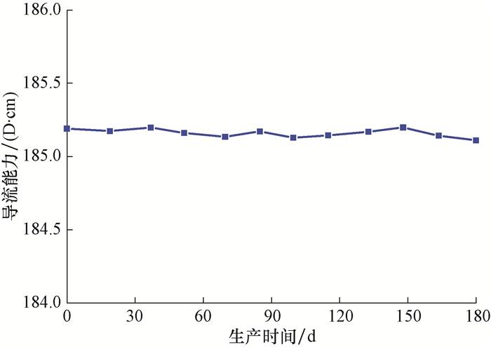 2.2 导流能力的计算达西定律有其适用范围,存在一个临界雷诺数Re1=(0.2~0.3),Re1是达西定律成立的上限,当Re<Re1时,渗流为线性渗流,符合达西定律[16]。从表 2可以看出,通道压裂支撑剂充填层中流体的雷诺数均远小于临界雷诺数,其渗流可以视为符合达西定律。由图 5(f)-图 5(i)可以求得平均压降Δp=1.140 Pa,x方向入口、出口流速均为v=5.664×10-6 m/s。根据式(9)可以计算出该井刚投产时的裂缝视导流能力为185.19 D·cm。同理,可以计算出其他生产时刻下的裂缝导流能力,结果如图 6所示。