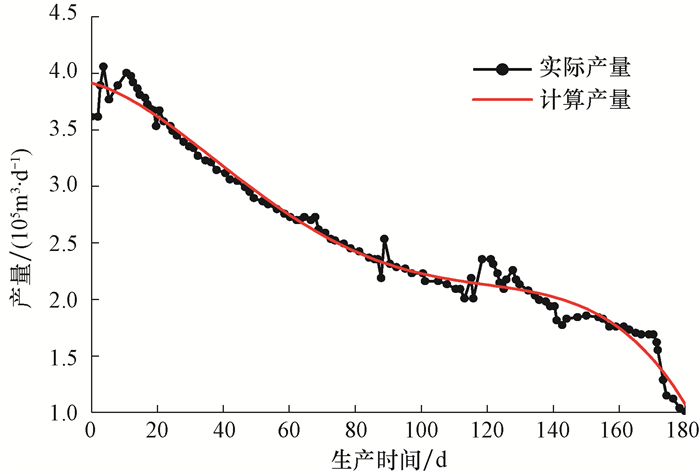 为验证模拟结果的准确性,采用B.R.Meyer等人[17]提出的压裂井产能公式,结合模拟计算的导流能力等数据计算了A井自某一生产时刻开始至180 d后的产量,并与实际产量进行了对比,结果如图 8所示。