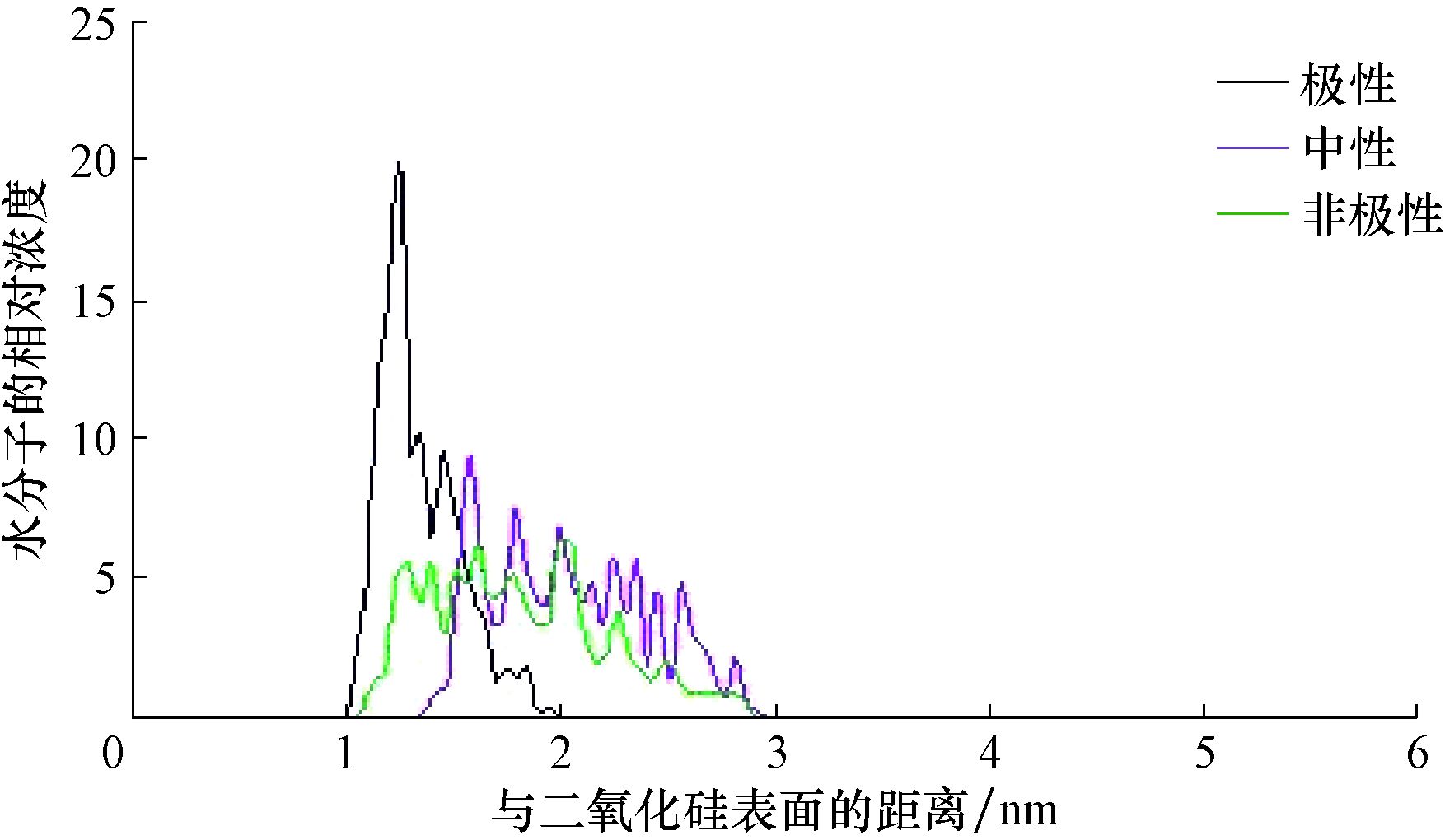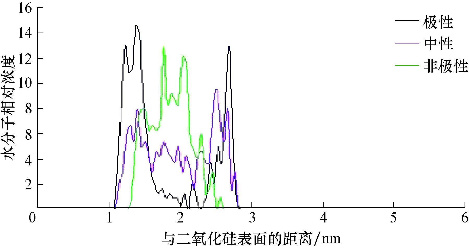 | 图 1 不同极性二氧化硅表面的水分子相对浓度分布剖面 Fig.1 Profile of relative water molecule concentration distribution on the surface of silica with different polarity |