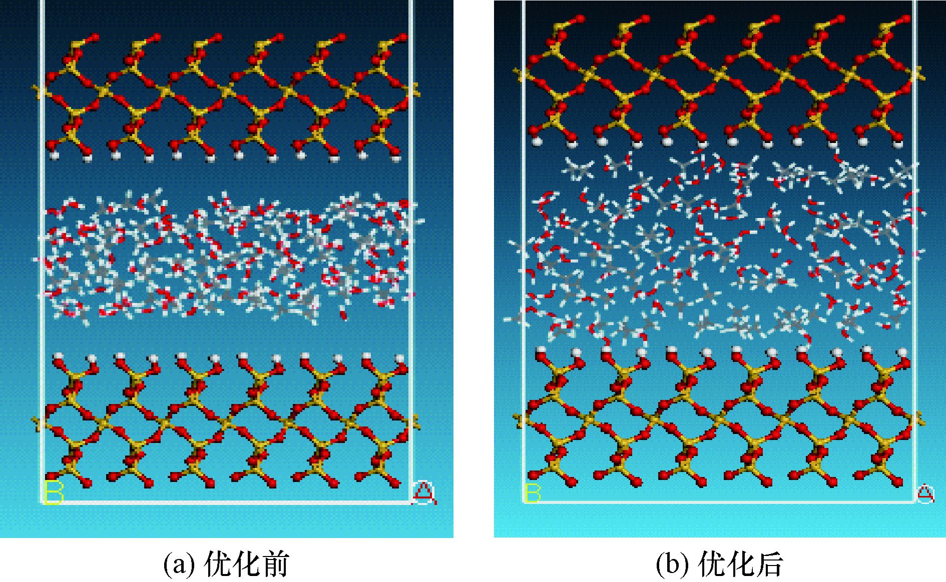 2.2 地层孔隙模型的建立与参数设定在上述表面构造的基础上建立孔隙结构 (如图 2所示),进行CH4吸附的动态模拟。晶胞参数a=2.456 7 nm,b=2.552 9 nm,c=7.834 3 nm,α=β=γ=90°,吸附体系中CH4分子80个,水分子120个,二氧化硅表面吸附层厚度为1 nm[4, 17]。模拟采用GCMC方法[11],周期性边界条件,选择COMPASS力场,在恒定分子数 (N)、恒定体积 (V) 和恒定温度 (T) 的NVT系统下进行分子动力学模拟,模拟温度设为340 K,时间为500 ps,截断半径为0.95 nm;采用Atom based方法处理范德华相互作用;采用Edward加和方法处理静电相互作用,采用Lennard-Jones势能模型处理原子间的相互作用[14]。
