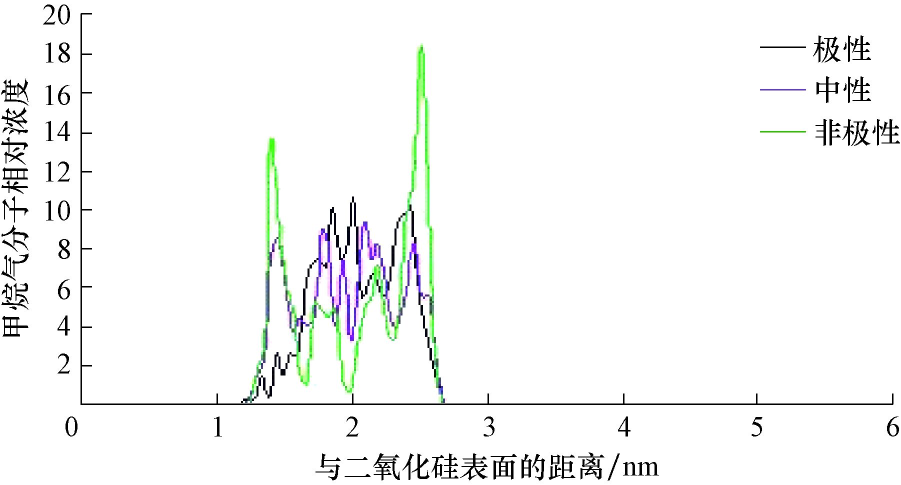 从图 3、图 4可以看出,极性表面会首先吸附一层水膜,厚度为0.16~0.50 nm,大约11%的CH4被吸附;中性表面水和CH4之间界限比较明显,水与CH4的相对浓度分布较杂乱,但对水的吸附更明显;非极性表面则首先吸附CH4分子,厚度为0.37~0.42 nm,有大约71%的CH4被吸附。试验结果表明,模拟过程合理,非极性表面对于水有排斥作用,曲线向右推迟,极性表面对CH4的吸附不明显。