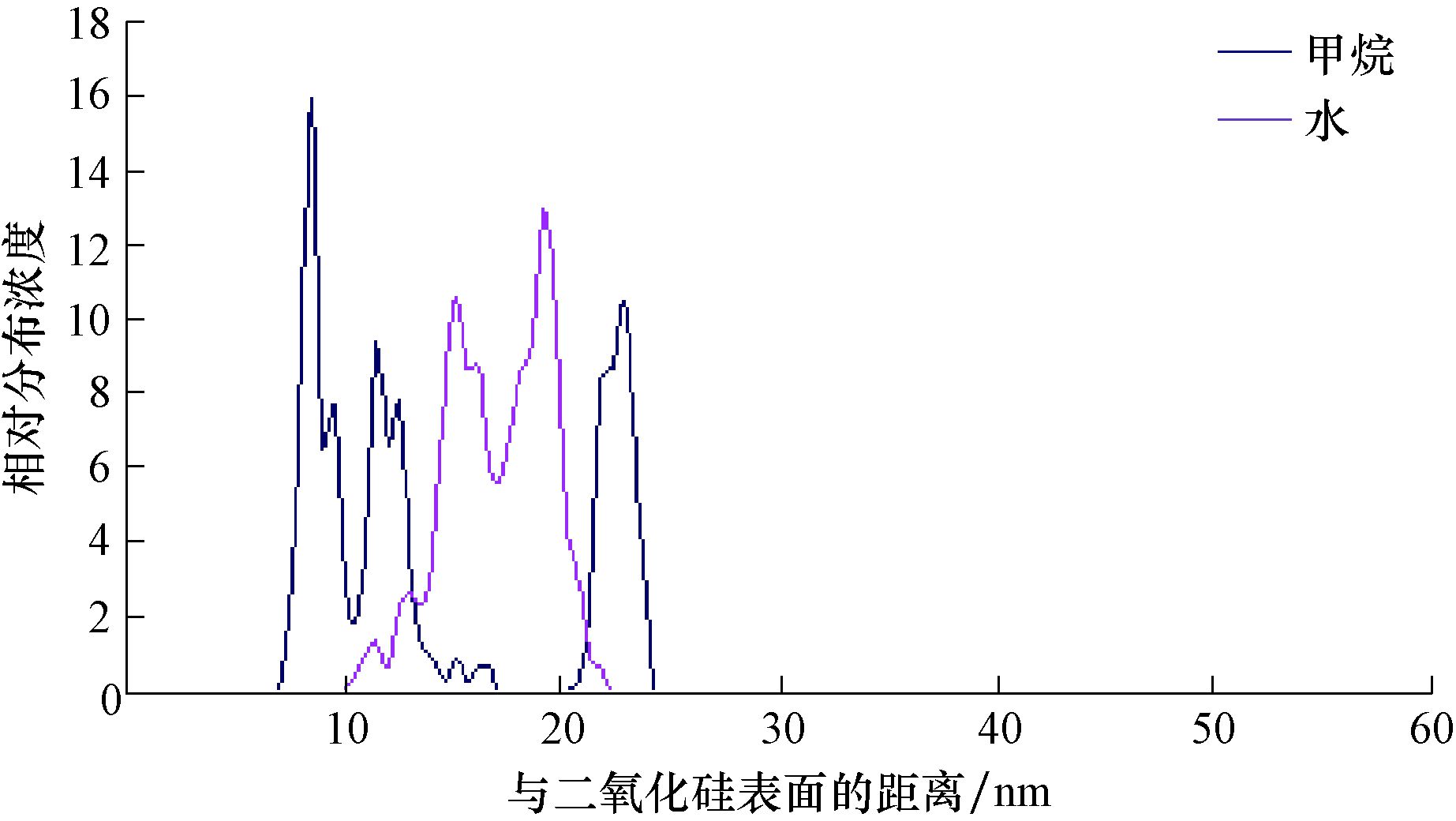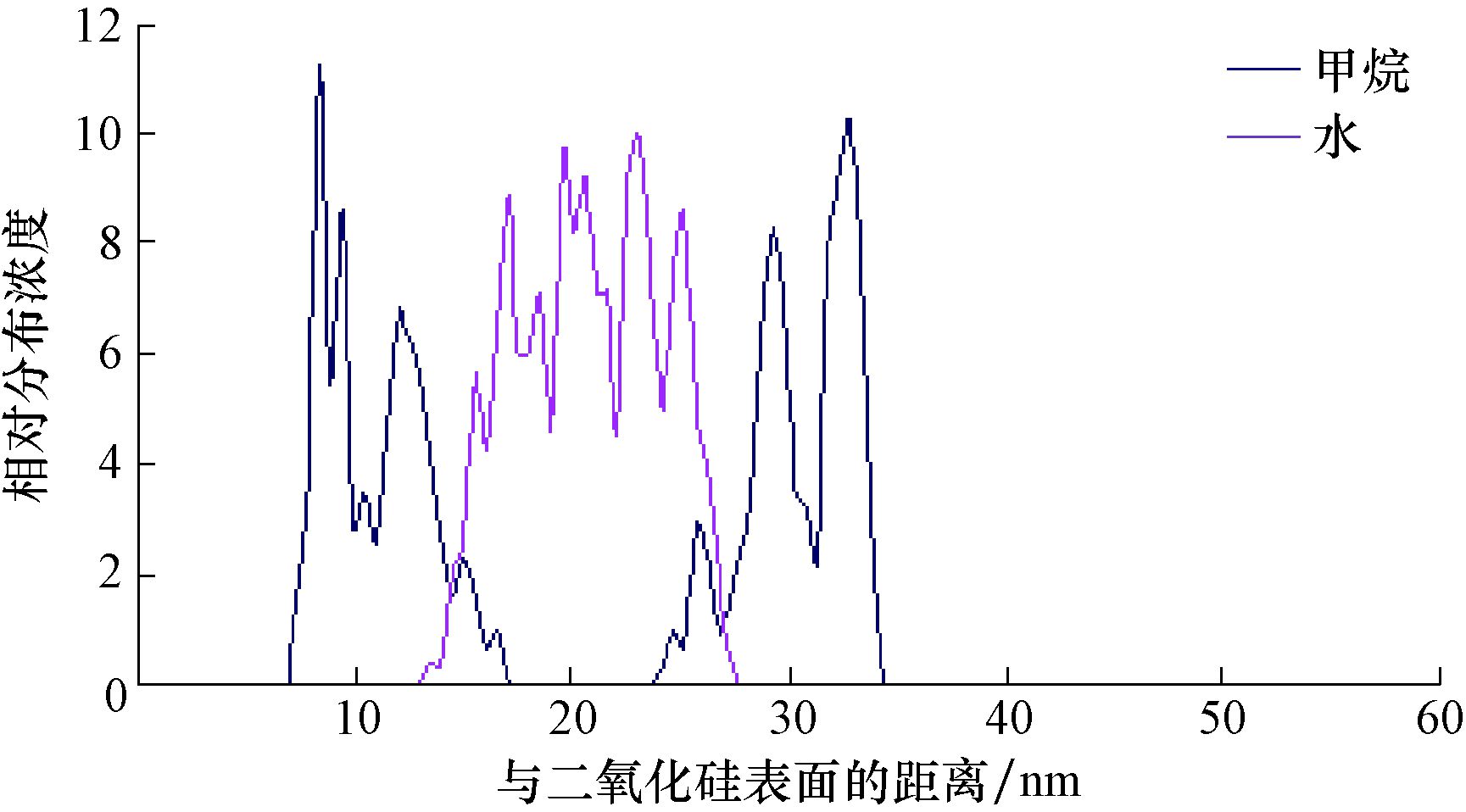 | 图 5 小孔隙石墨表面CH4与水分子相对浓度分布剖面 Fig.5 Profile of relative CH4 and water molecule concentration distributions on the surface of graphite with micro pores |