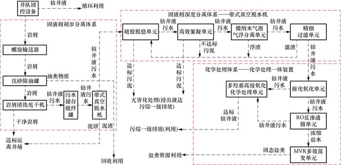 废弃钻井液固液分离—化学处理技术使用的设备包括:钻井液固液初步分离体系(由螺旋输送器、沉砂除油罐、岩屑清洗甩干机和污水储存搅拌罐等组成),以带式真空脱水机(包括破胶-混凝絮凝单元、微纳米气泡气浮分离单元和精细过滤单元)为主的固液深度分离体系及以化学处理一体式装置(包括催化氧化单元、RO反渗透膜单元、多羟基高级氧化化学处理单元和MVR多效蒸发单元)为主的废水化学处理体系等3个部分(见图 1)。