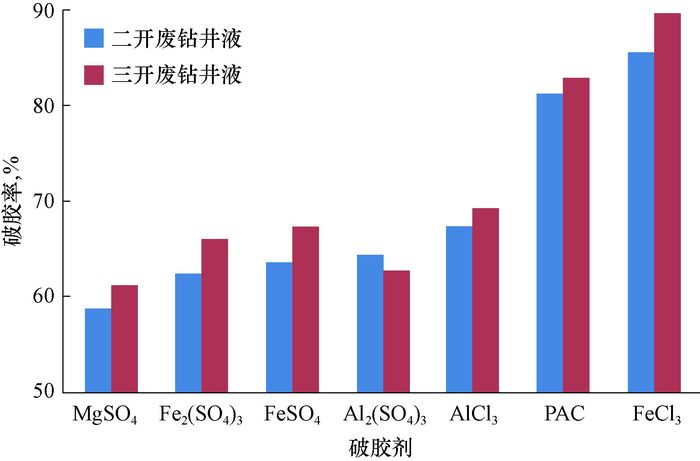 破胶剂的选择是该环节的关键,其破胶率受破胶剂类型、温度、压力和破胶时间的影响。在常温、常压下分别取相同体积的长北气田某水平井二开和三开井段的废钻井液样品各7份(其中,二开井段的钻井液为KCl-聚合物钻井液, 三开井段的钻井液为低伤害无固相钻井液),分别加入2.0 g的破胶剂MgSO4、Fe2(SO4)3、FeSO4、Al2(SO4)3、AlCl3、PAC和FeCl3,搅拌10 min后,再静置沉降30 min,将各样品过滤并测量滤液的体积,滤液体积除以原样品体积即为对应破胶剂的破胶率,以此为依据对破胶剂进行优选,试验结果见图 2。
