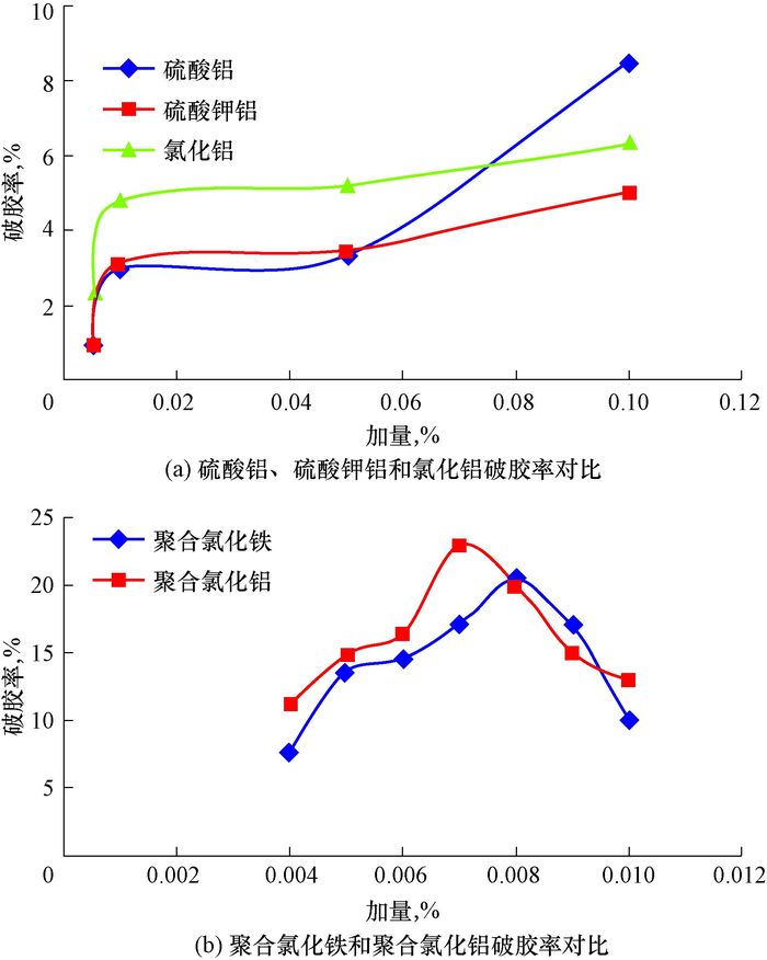 由图 3可知,5种絮凝剂中,聚合氯化铝对钻井液污水混凝絮凝效率最高,破胶率达到了23%,且最佳用量最少,仅为0.007%,故优选聚合氯化铝为混凝絮凝剂。