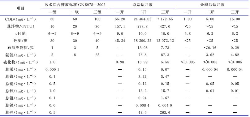 3.1 废弃钻井液处理后的污水性能CB10-2井为双分支水平井,一开井段采用清水聚合物钻井液体系,处理剂主要包括膨润土、烧碱和聚阴离子纤维素(高黏)PAC-HV提黏剂;二开井段采用KCl-聚合物钻井液体系,应用的主要处理剂包括KCl、GD-K(3)、G309-JLS、XCD、PAC-HV、PAC-LV、G303-WYR和重晶石;三开井段采用低伤害无固相钻井液体系,应用的主要处理剂包括甲酸钠、GD-K(3)、XCD、PAC-HV、PAC-LV、DFL-1和石灰石等。