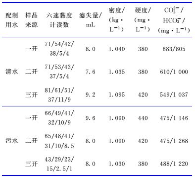 从表 2可以看出,除了用钻井液污水配制的三开钻井液的六速黏度计读数比清水配制的稍低外,滤失量、密度、硬度和CO32-与HCO3-质量浓度等性能均相差不大,表明处理后的钻井液污水与钻井液处理剂的配伍性较好,可以用于现场配制钻井液。