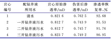 3.1.3 处理后钻井液污水配制的钻井液对储层伤害试验要将固液分离—化学处理技术处理后的钻井液污水用于配制钻井液,除了确保其与钻井液处理剂配伍之外,还要确保其不会伤害储层。鉴于此,按照三开井段钻井液配方,分别用清水、处理后的一开、二开和三开井段钻井液污水配制钻井液,并选取了Yu25井山2段相邻4块岩心,采用美国AC-FDS-800-10000地层伤害测试系统, 在温度90℃、围压12 MPa、入口压力3.5 MPa、出口压力0 MPa条件下对岩心进行了钻井液伤害室内试验,结果见表 3。