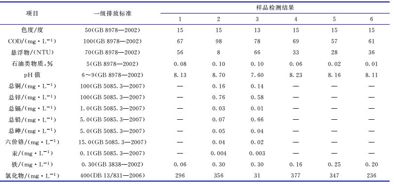 从表 4可以看出,CB10-2井废弃钻井液经固液分离—化学处理后的岩屑和污泥样品浸出液的pH值、色度、COD、铜、锌、镉、铅、砷、六价铬、汞、铁和氯化物含量均低于一级排放标准,表明处理后的污泥和岩屑达到了固体废弃物排放或重新利用的标准。