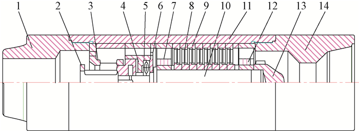 | 图 1 涡轮式压力脉冲发生器的结构 Fig.1 Structure of the mud pulse generator driven by turbine 1.下接头; 2.阀芯;3.阀座;4.压力平衡装置;5.推力轴承;6.轴承端盖;7.下扶正轴承;8.涡轮转子;9.涡轮定子;10.涡轮轴;11.壳体;12.上扶正轴承;13.蘑菇头;14.上接头 |