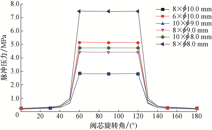 3) 钻井液流量一定时,柱阀的固定节流总过流面积主要影响脉冲压力的最大值,而不改变脉冲压力高压区的宽度;可变的周向过流面积主要影响脉冲压力高压区的宽度,不改变脉冲压力幅值。