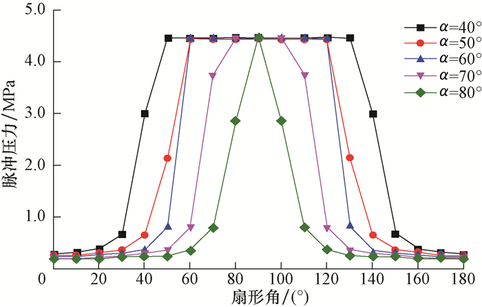 | 图 6 扇形角α对水力脉冲性能影响情况的模拟结果 Fig.6 Effects of fan angle α on the performance of hydraulic pulse |