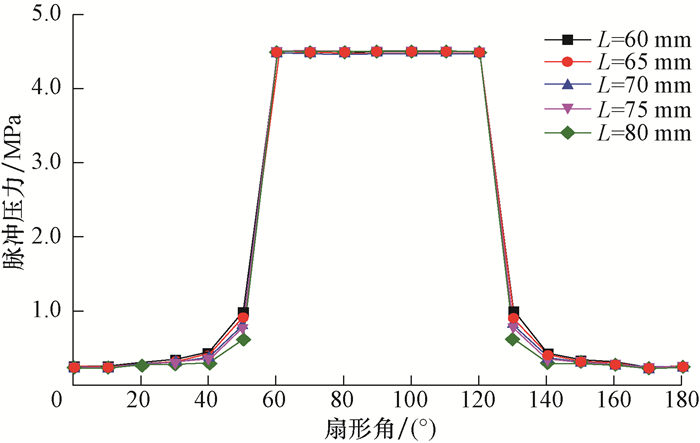 3.3 阀座周向过流槽轴向长度的影响保持固定节流总过流面积A1和阀芯柱面开口扇形角α不变(α=60°,A1=508.94 mm2),分别对5种周向过流槽轴向长度L(L分别为60,65,70,75和80 mm)的柱阀建立流道模型并进行CFD分析。L对柱阀水力脉冲性能影响情况的模拟结果见图 7。从图 7可以看出,L对脉冲压力性能几乎没有影响。