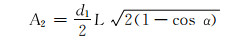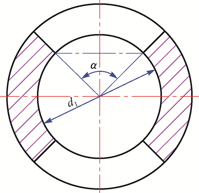 阀芯柱面开口扇形角α、阀座周向过流槽轴向长度L主要通过改变柱阀系统周向过流面积A2以影响系统脉冲压力,A2大小主要取决于阀芯柱面开口扇形角α和d1(如图 8所示)。A2的计算公式为: