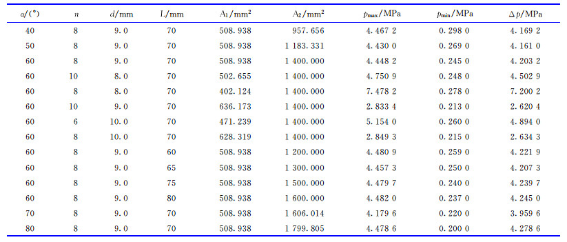 不同柱阀结构参数下脉冲压力极值的模拟结果见表 1。表 1中,pmax为系统高压脉冲宽度内的最大平均压力值,MPa;pmin为系统脉冲压力的最小值,MPa;压力波幅Δp=pmax-pmin。