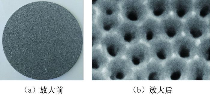 为此,笔者选用了一种由不锈钢粉末经过特殊工艺压制而成的薄片作为封堵介质,模拟不同级别的裂缝进行封堵性能评价试验。该薄片具有以下优点:1) 不锈钢粉末薄片孔径控制在微米级和纳米级之间,模拟孔径范围10 nm~500 μm(见图 2);2) 薄片厚度为5~10 mm,远远大于滤纸的厚度,可模拟封堵材料在裂缝内部通道的堆积和封堵情况,而不是封堵材料只在滤纸表面的堆积;3) 不锈钢粉末薄片剖面粗糙,与地层缝隙表面特征相近。