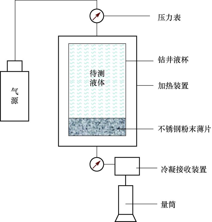 根据高温高压滤失仪的温度和压力控制原理,自主设计加工了一套封堵评价装置(见图 3)。该装置包括可以加热的钻井液杯、气源、压力表和冷凝接收装置等设备,钻井液杯底部的不锈钢粉末薄片为过滤介质。该装置工作温度为20~300 ℃,压力3.5~5.0 MPa。具体操作步骤为:打开钻井液杯下杯盖,将不锈钢粉末薄片置于杯底;盖上下杯盖并拧紧;加入待测液体,并封好上杯盖,即可模拟井底温度条件进行待测液体封堵性能评价试验。