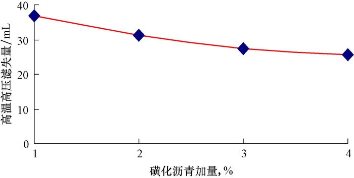 | 图 5 不同磺化沥青加量下的水基钻井液滤失量曲线 Fig.5 HTHP filtering losses of water-based drilling fluid under different volumes of sulfonated asphalt |