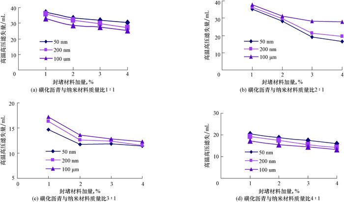 3.2 强封堵型水基钻井液配方优化试验 3.2.1 不锈钢粉末薄片封堵试验为改善致密油水平井水基钻井液的封堵防塌能力,提高对纳米级裂缝的封堵效果,将磺化沥青与纳米材料按照质量比1:1,2:1,3:1和4:1进行复配,并加入钻井液中,加量分别为1%,2%,3%和4%,分别应用孔径50 nm、200 nm和100 μm的不锈钢粉末薄片进行封堵评价试验,结果见图 6。