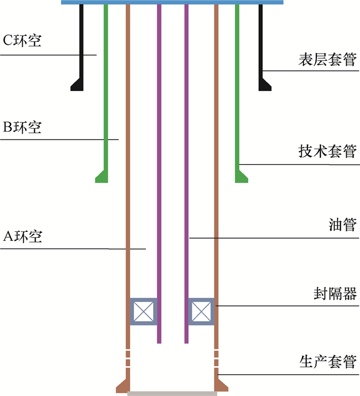 1 井筒完整性评估方法与模型 1.1 井筒关键结构完整性失效风险评估常规高压油气井的管柱结构如图 1所示,其井筒关键结构(点)完整性失效风险评估主要包括油管与A环空的密封失效风险评估及B环空与C环空的密封失效风险评估2方面,是油气井井筒综合完整性评估的基础。评估流程见图 2。