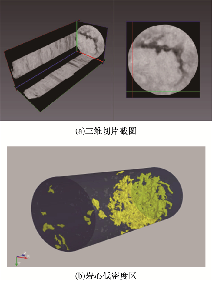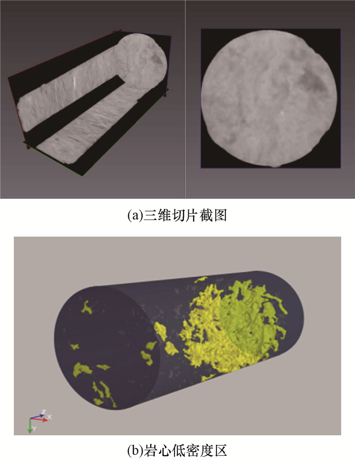 通过计算机软件处理后,可进一步识别岩心中的低密度区分布情况,见图 1(b)与图 2(b),从而可以分析岩石中的孔隙、裂缝的分布情况。图中的黄色部分是岩心中的低密度区,即裂缝或弱面。