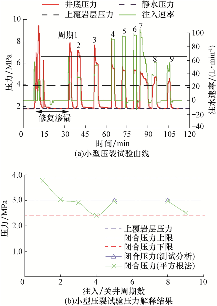 | 图 4 油砂盖层小型压裂试验曲线及压力解释结果 Fig.4 Mini-fracturing test results and stress analysis results of cap rock |