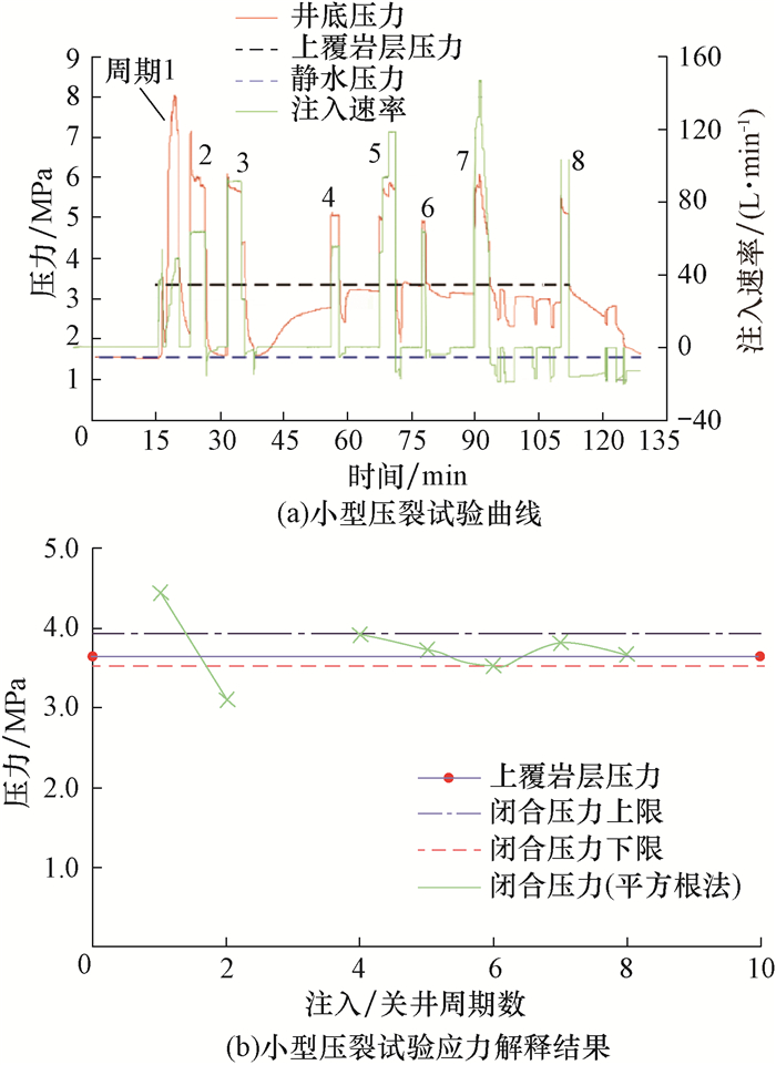 通过周期性地向地层泵注高压水,在地层中产生裂缝并扩展一定距离。在现场用地面和井下压力传感器监测井底压力,并记录注入过程中的压力和注入速率数据。地面压力传感器记录数据加上井筒静水柱压力可得到井底压力,根据密度测井曲线可计算上覆岩层压力。最小地应力或裂缝闭合压力可由2种压力数据解释方法得到:一种是压力与时间的平方根关系曲线,另一种是关井后回流测试数据分析[12]。