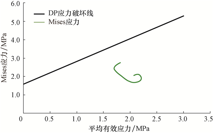 5.3 盖层应力变化曲线根据前面模拟计算的地层Mises应力分布,得到了在SAGD生产过程中盖层应力集中区一点处的Mises应力与平均有效应力(上覆岩层压力与孔隙流体压力之差)的变化曲线(见图 9)。因为盖层主要为页岩,表现为弹塑性特征,因此,根据DP(Drucker-Prager)破坏准则[13],在SAGD生产期内应力变化始终没有达到DP剪切破坏线(DP内摩擦角为51°、粘聚力为1.6 MPa),说明在设计温度和压力下盖层不会发生形变,保持了较好的稳定性。
